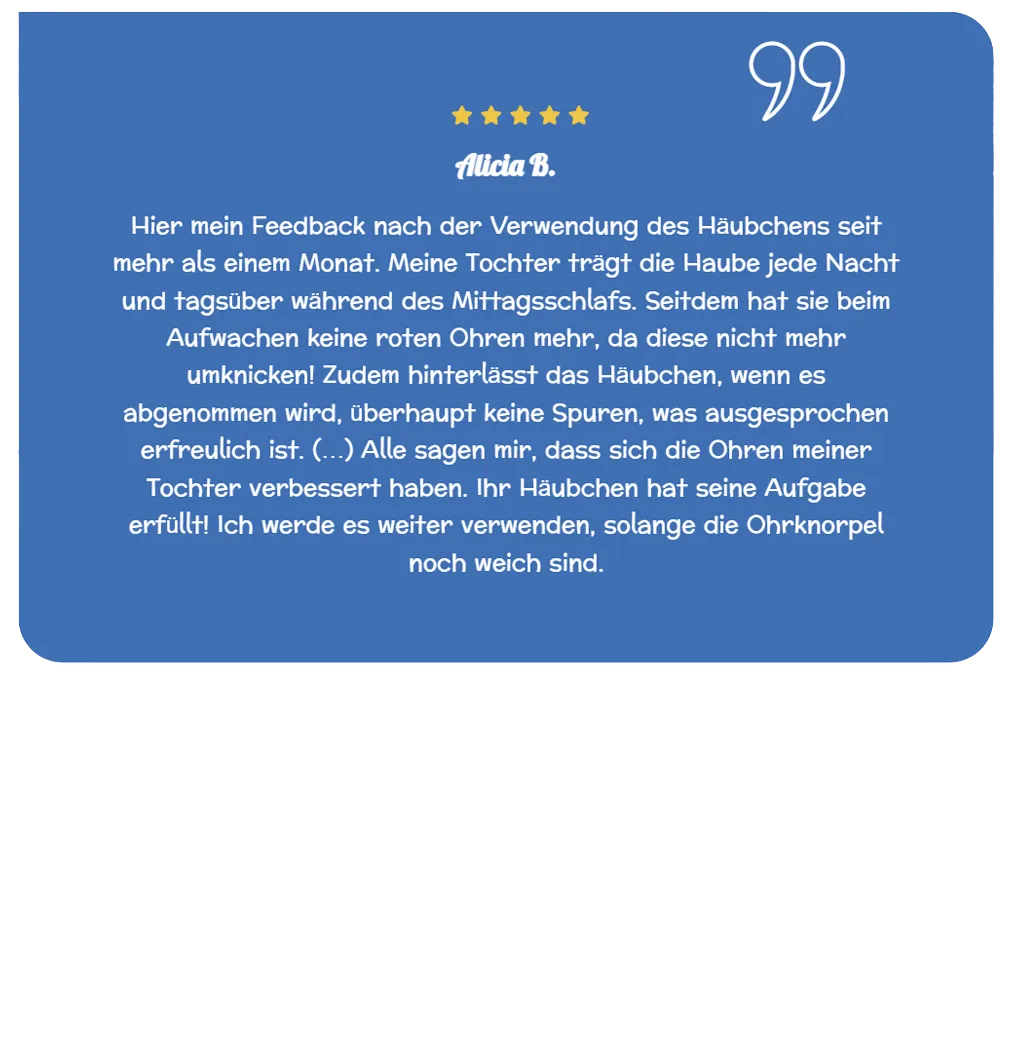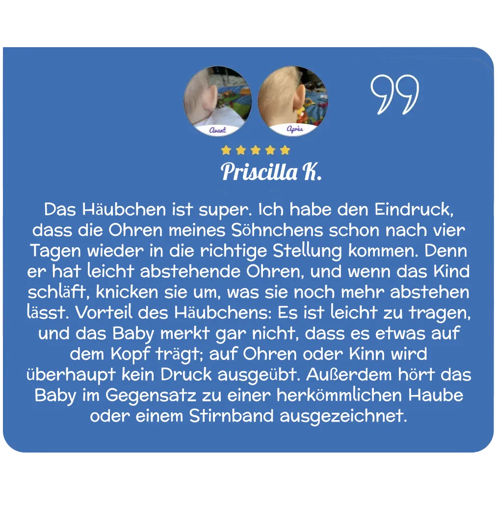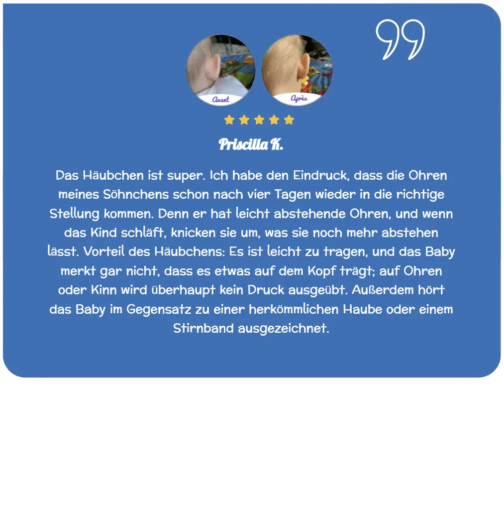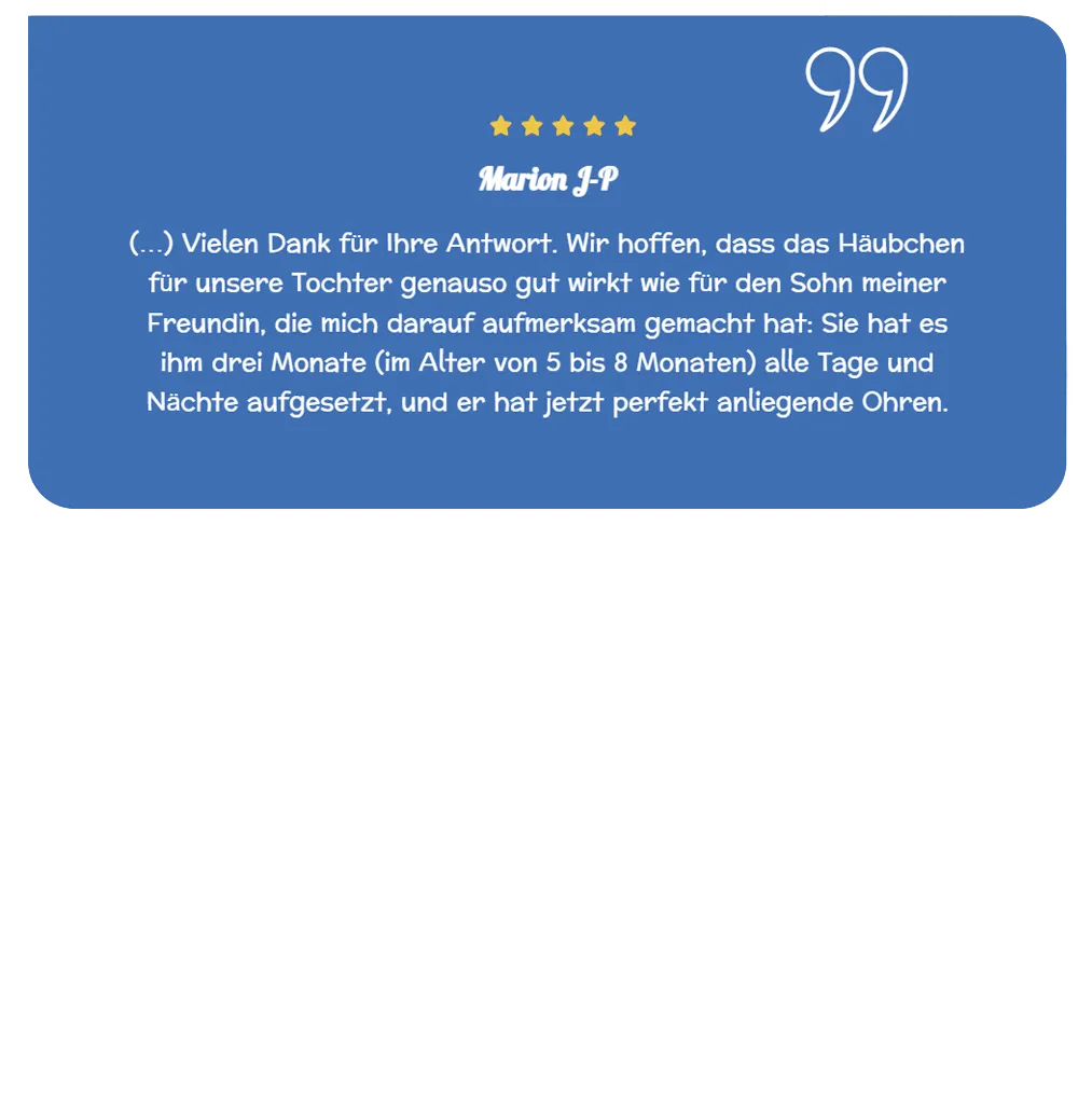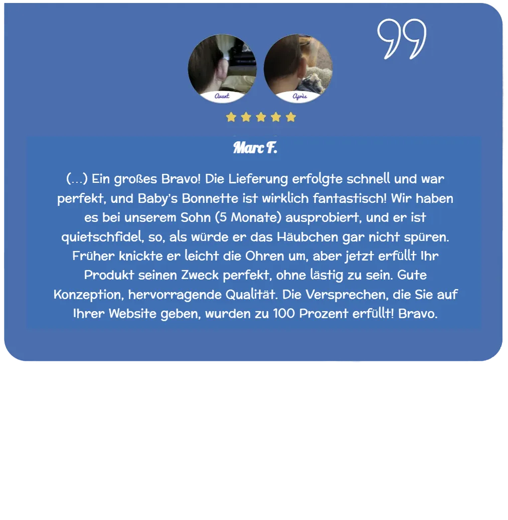 Baby’s Bonnette® drückt nicht auf den Kopf und passt sich allen Babys von der Geburt bis zu einem Alter von 18 Monaten an. Im Gegensatz zu Stirnbändern oder Pflastern ist es ein einfaches und sicheres therapeutisches Hilfsmittel für Ihr Kind. Es hilft, abstehende und nach hinten geneigte Ohren Ihres Babys zu korrigieren.