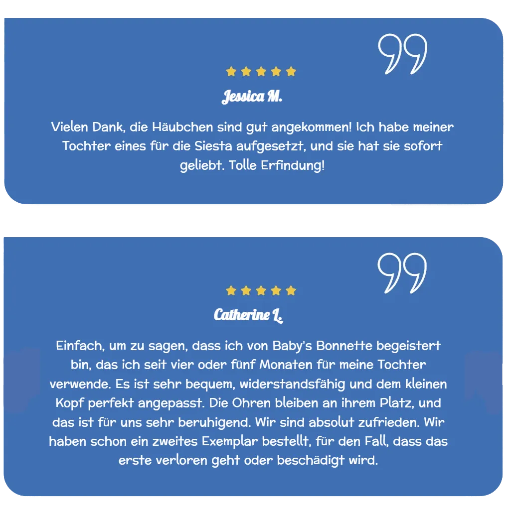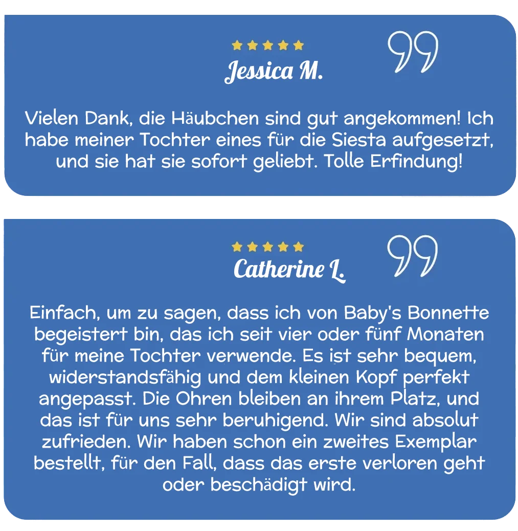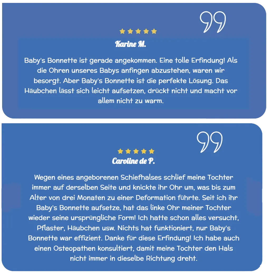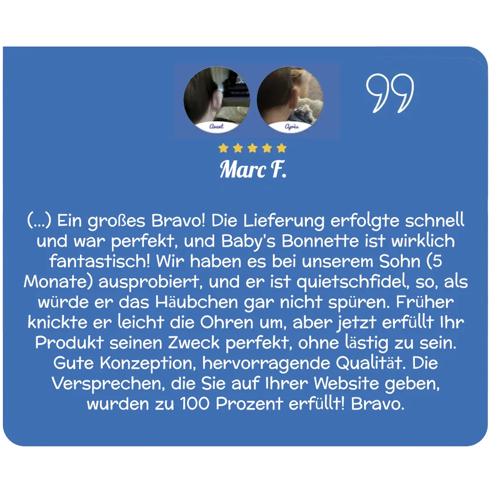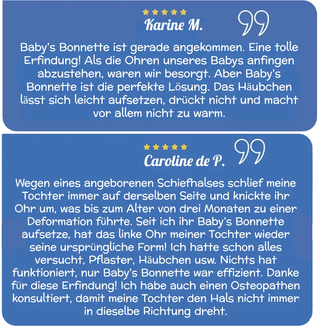 Baby’s Bonnette ® ist ein innovatives Produkt und seit 2012 das erste patentierte Gerät, das speziell dafür entwickelt wurde, zu verhindern, dass Babys im Schlaf auf einem umgeknickten Ohr liegen oder sich während ihrer täglichen Aktivitäten die Ohren umdrehen.