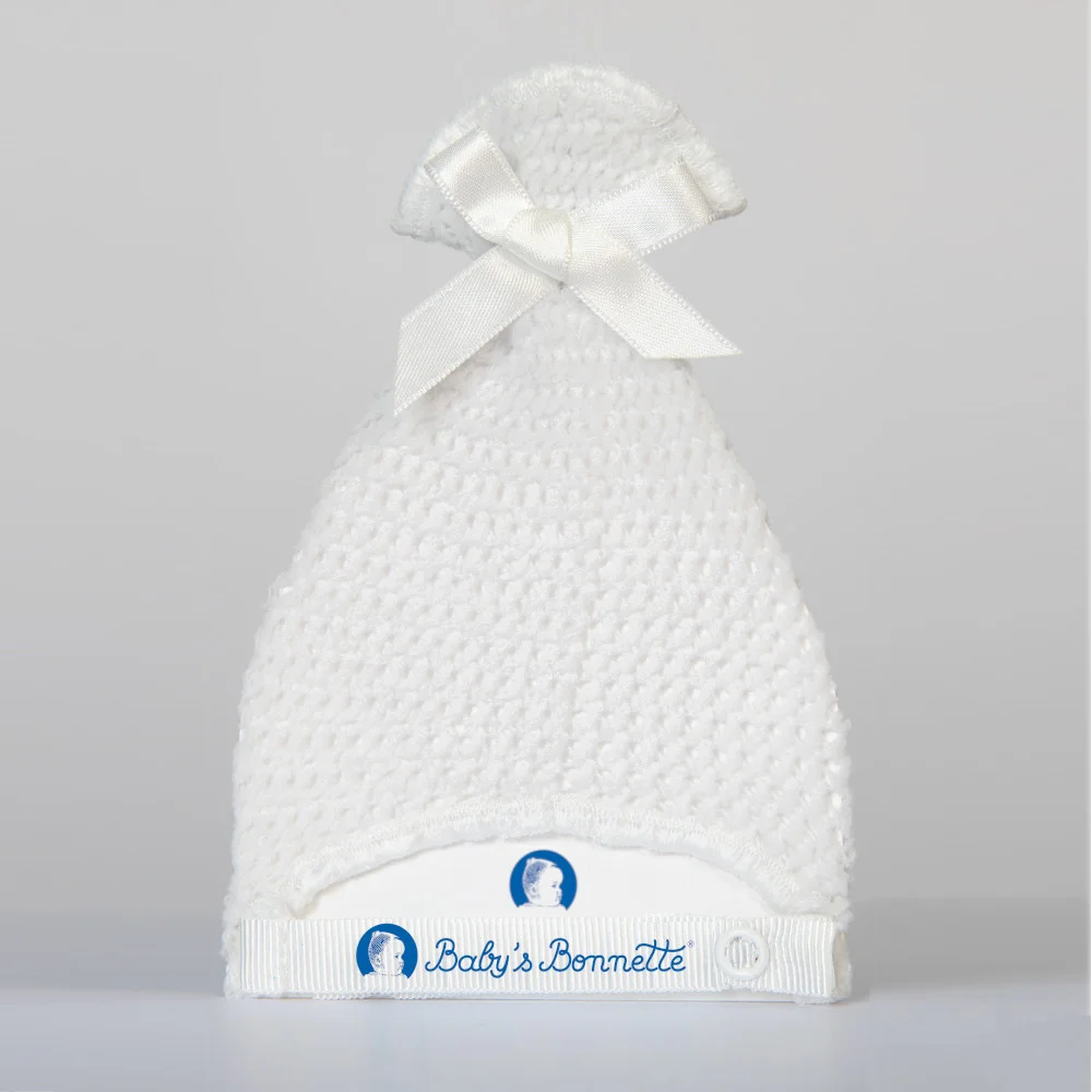 Ultra-stretch knitted bonnet specially designed to prevent ears from folding over and that keeps baby’s ears flat.